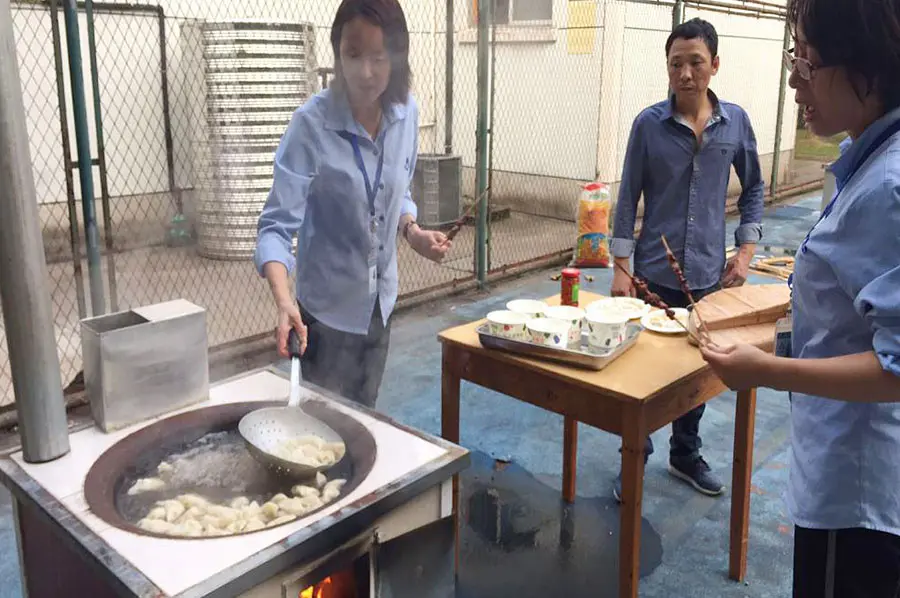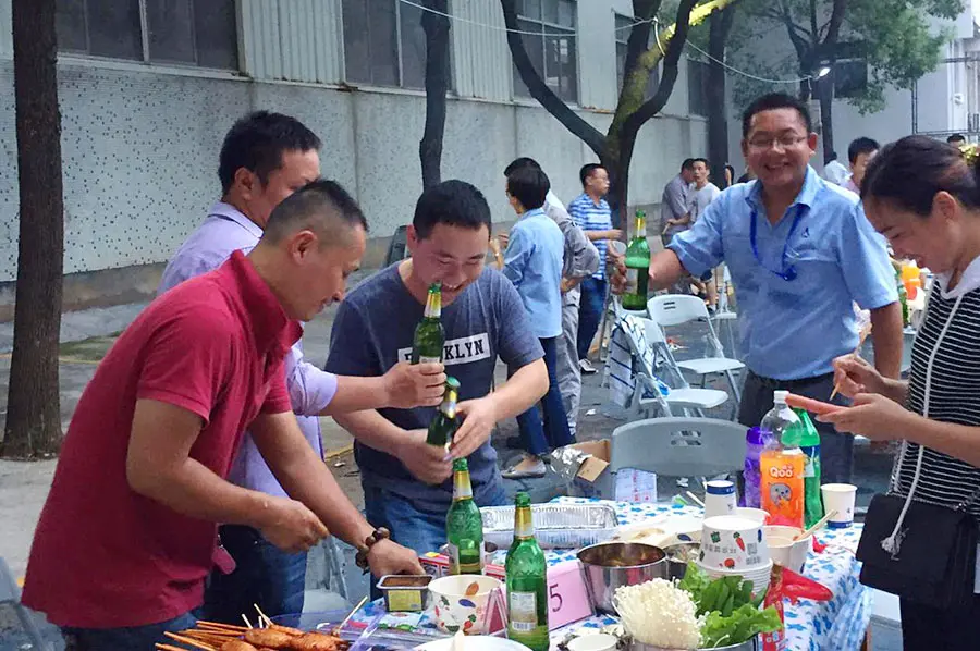 不到十分钟,诱人的香味便弥漫整个空间,飘香的烤肉、香喷喷的饺子、可口的饮料、月饼、啤酒,大家尽情享受着“美味佳肴”,其乐融融,大家争先品尝着自己亲手烤制的菜品,畅谈着工作和生活里发生的趣事,这时候体现出一份家的温馨!大家在这个和谐大家庭里,感受着亲人之间的温馨。烧烤晚会拉近了领导和员工之间的距离,使大家感受到了大家庭的温暖,增添了集体的凝聚力,同时提高了员工对生活和工作的热情,更加展现了浙江甬金公司良好的企业文化氛围。